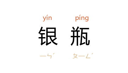 ⒊ 浙江省城西湖畔的一口井名。相传岳飞有幼女,闻飞被害,抱银瓶投井而死,乡人祀之,乃将此井名为「银瓶井」,后人覆井筑亭取名「孝泉亭」,并称岳女为「银瓶娘子」。