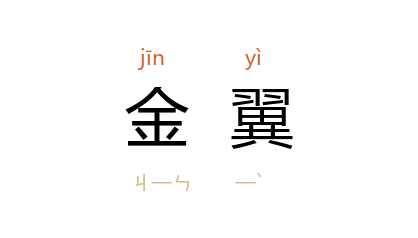 ⒈ 金色的翅膀。亦借指鸟。