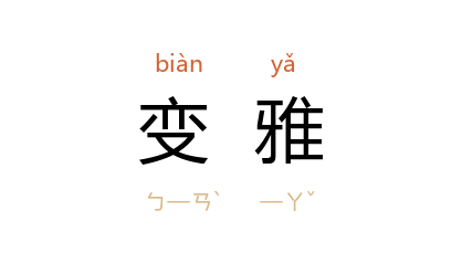 ⒈ 《诗经·小雅》自六月至何草不黄,〈大雅〉民劳至召旻,皆为周朝中衰后乱世所产生的作品,故称为「变雅」。与治世所产生的正雅相对。