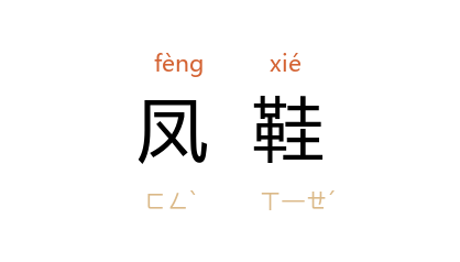 引宋 刘过 《沁园春·美人指甲》词:“见凤鞋泥污,偎人强剔。”元 岑安卿 《美人行》:“露晞香逕苔蘚肥,凤鞋湿翠行迟迟。”清 洪昇 《长生殿·禊游》:“一隻凤鞋套儿。”