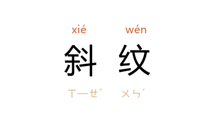 ⒈ 一根经纱和两根纬纱间错着织成的纹路,因为交织点相错,看上去是斜的。亦指斜纹布。