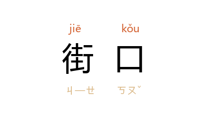 引清 梁章鉅 《归田琐记·洪文襄公》:“五六辈者又急出街口肃送毕,徐步而归。”《官场现形记》第二七回:“於是 王博高 雇了一辆站街口的轿车,扶他上车。”丁玲 《母亲》二:“在十字街口一个小酒馆里,还流荡得有谈笑的声音。”