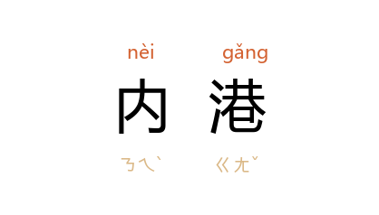 ⒈ 离海较远的港口部分。一般港口可以人工建筑物或狭隘航道分隔成内港、外港两部分,内港较外港有更妥善的保护,通常是船舶停泊的主要地区。