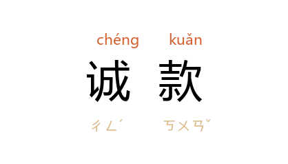 引《三国志·蜀志·邓芝传》:“权 大笑曰:‘君之诚款,乃当尔邪!’”《北齐书·神武帝纪下》:“神武 至 河 北十餘里,再遣口申诚欵, 魏帝 不报。”宋 苏辙 《龙川别志》卷上:“老将大校,多归心者,虽宰相 王溥,亦阴效诚款。”明 郎瑛 《七修类稿·国事二·张昶》:“昶 外示诚款,内怀阴计。”苏曼殊 《断鸿零雁记》第十二章:“欲贡诚款,又不工於词。”
