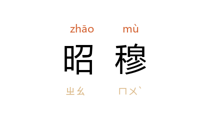 ⒈ 宗庙的辈次排列。古代宗庙制度,天子七庙,诸侯五庙,大夫三庙。以天子而言,太祖庙居中;二、四、六世居左,称为「昭」;三、五、七世居右,称为「穆」。见《礼记·王制》。祭祀时,子孙也按此规定排列行礼。