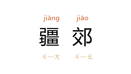 ⒈ 指郊外。《管子·幼官》:“旗物尚赤,兵尚戟,刑则烧交疆郊。”尹知章注:“其用刑,则于疆郊焚烧而交也。”于省吾《双剑誃诸子新证·管子一》:“交乃烄之借字。《说文》:'烄,交木然也。'烧烄謰语,烄亦烧也。”一说,疆郊即“僵槁”。“烧交疆郊”读作“烧烄僵槁”,指火刑。见赵守正《管子注译》。