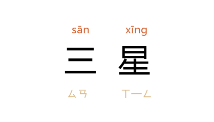 英语Sanxing or Sanhsing township in Yilan county 宜蘭縣|宜兰县[Yi2 lan2 xian4], Taiwan, Samsung (South Korean electronics company), three major stars of the Three Stars 參宿|参宿[Shen1 xiu4] Chinese constellation, the belt of Orion, three spirits 福[fu2], 祿|禄[lu4], and 壽|寿[shou4] associated with the Three Stars 參宿|参宿[Shen1 xiu4] Chinese constellation