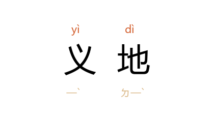 引《二十年目睹之怪现状》第一〇六回:“到得 天津,便找到了一处义地,把他祖父的棺材厝了。”巴金 《沉默集·春雨》:“我们走出了义地,看不见一辆车,只得冒着雨在泥水中走路。”