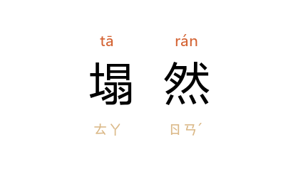 引唐 杜甫 《垂老别》诗:“弃絶蓬室居,塌然摧肺肝。”宋 苏舜钦 《遣闷》诗:“白鵠翅翼伤,塌然困泥涂。”宋 苏辙 《阻风》诗:“我舟恃长风,风止将安为?塌然委积水,坐被弱缆维。”明 谢榛 《四溟诗话》卷三:“﹝鸟﹞力竭始下,塌然投於中林矣。”