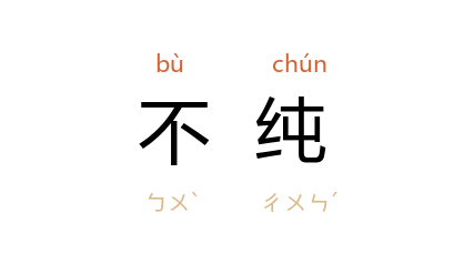 引《逸周书·大开武》:“德不纯,民乃失常。”《史记·孝文本纪》:“驯道不纯而愚民陷焉。”胡采 《序<在和平的日子里>》:“比如说,他当初参加革命动机不纯,在社会主义建设时期,他个人主义发展了,患得患失,怕困难,怕负责任等等。”