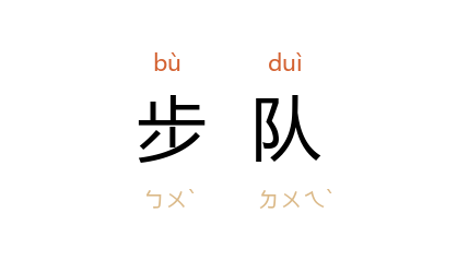 引《新唐书·兵志》:“每校为步队十,骑队一。”中国近代史资料丛刊《辛亥革命·徐锡麟安庆起义清方档案》:“三十四标统带 艾忠琦,率带 南琛 江元 兵轮两艘、步队两队前来,相机镇慑。”郑观应 《盛世危言·海防下》:“德国 武备院尚有 日本 人肄业,或在步队,或在马队,或在炮队。”