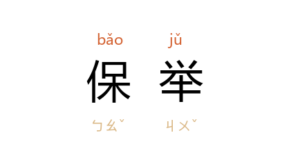 ⒈ 古时由大臣奏请提升有特别技能、学识或功绩的人才,供朝廷任用,并为其作保,称为「保举」。