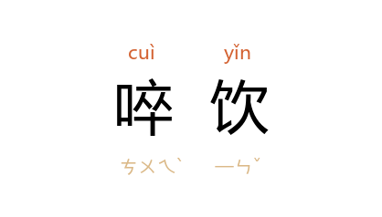 引宋 梅尧臣 《十一月十二日赛昭亭神》诗:“琵琶嘈嘈神降言,福汝佑汝无灾蘖。西向啐饮东向迴,谿心却望山崔嵬。”《元史·祭祀志三》:“亚献再拜受爵,跪祭酒,遂啐饮。”