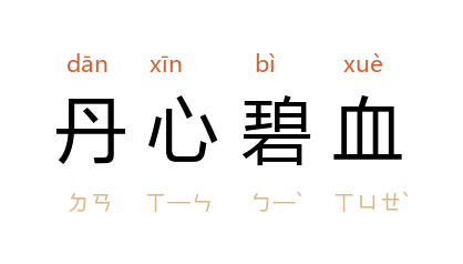 ⒈ 丹心:红心、忠心。碧血:血化为碧玉。碧:青绿色的宝石,表示血的珍贵。赤诚的忠心,宝贵的鲜血。用以赞扬为国捐躯的重大牺牲。