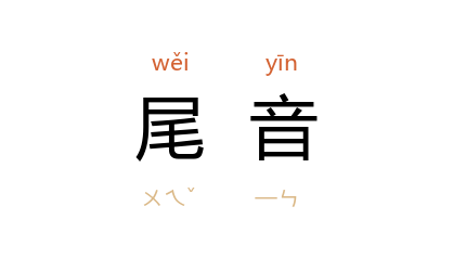 ⒈ 读字、词、句时,最后拉长的音。尾音的音素,通常是开尾韵的主要元音、阴声韵尾、阳声韵尾,如:牙(iā) 的(a) 、开(kāi)的(i) 、关(guān) 的(n) 。