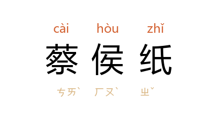 引《后汉书·卷七八·宦者传·蔡伦传》:「伦乃造意,用树肤、麻头及敝布、鱼网以为纸。元兴元年奏上之,帝善其能,自是莫不从用焉,故天下咸称『蔡侯纸』。」