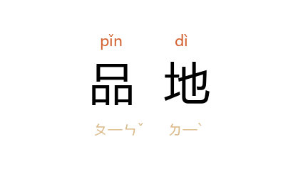 引宋 王谠 《唐语林·栖逸》:“陈(陈寡言)徐(徐虚符 )在东南,品地比 田(田良逸)蒋(蒋含宏 ),而 冯(冯云翼 )在 欧阳(欧阳平 )之列。”明 李贽 《四书评·论语·宪问》:“据 子路 之问,品地尽高,与‘问为邦’近矣。”清 纪昀 《阅微草堂笔记·槐西杂志四》:“释家诚与儒家异,然彼此均各有品地。”