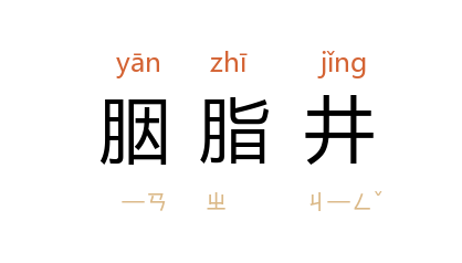 ⒈ 亦作“臙脂井”。即 南朝 陈 景阳宫 的 景阳井,故址在今 南京市。隋 兵南下, 后主 与妃 张丽华、孔贵嫔 并投此井,卒为 隋 人牵出,故又名 辱井。井有石栏,呈红色,好事者附会为胭脂所染,呼为 胭脂井。