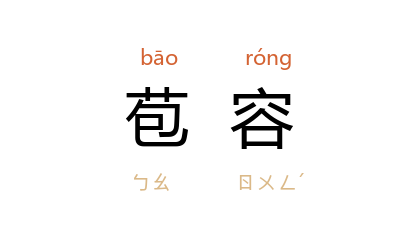 引《晋书·姚兴载记上》:“兴 留心政事,苞容广纳,一言之善,咸见礼异。”唐 韩愈 《答李秀才书》:“元宾 行峻洁清,其中狭隘,不能苞容。”《资治通鉴·魏邵陵厉公嘉平五年》:“峻 与 胤 虽内不沾洽,而外相苞容,进 胤 爵 高密侯,共事如前。”