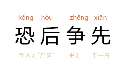引《二十年目睹之怪现状》第六八回:“他却横衝直撞,恐后争先。”郭沫若 《女神·心灯》:“纸鸢们也像欢喜太阳:一个个恐后争先,争先恐后,不断努力,飞扬,向上。”