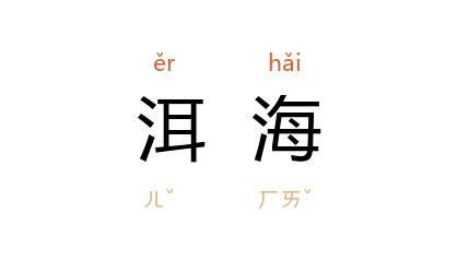 ⒈ 湖名。古称 叶榆泽。在 云南省 大理市、洱源县 间。因其形如耳得名。西汇 点苍山 麓诸水,冲积为肥沃的 大理平原。北纳 西洱河,流出 大理市,汇合 漾濞江,注入 澜沧江。有“三岛”、“四洲”、“九曲”之胜,是著名风景区。