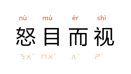 引《三国演义·第三回》:「时李儒见丁原背后一人,生得器宇轩昂,威风澟澟,手执方天画戟,怒目而视。」《隋唐演义·第七三回》:「太后怒目而视,别了三思回宫。」