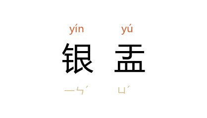 引唐 白居易 《早饮湖州酒寄崔使君》诗:“十分蘸甲酌,瀲灧满银盂。”亦作“银折盂”。 《金瓶梅词话》第六五回:“忽报 宋御史 老爹差人来送贺 黄太尉 一桌金银酒器:两把金壶……两副银折盂。”