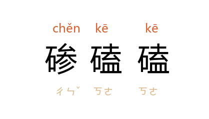 引《梧桐雨·第三折》:「怎下的碜磕磕马蹄儿脸上踏,则将细袅袅咽喉掐。」《长生殿·第三三出》:「是唐天子的贵妃杨玉环,碜磕磕黄土坡前怨屈。」