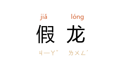⒈ 汉刘向《新序·杂事五》:“叶公子高好龙,钩以写龙,凿以写龙,屋室雕文以写龙。于是夫龙闻而下之,窥头于牖,施尾于堂。叶公见之,弃而还走,失其魂魄,五色无主,是叶公非好龙也,好夫似龙而非龙者也。”后以“假龙”比喻徒有虚名而无其实的事物。