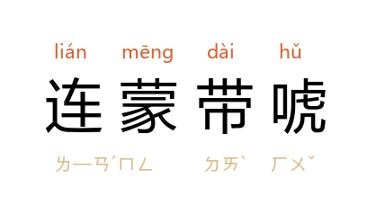 引老舍 《鼓书艺人》十三:“宝庆 开始排练……有些字实在念不上来,就连蒙带唬,找个合辙押韵的词补上。”老舍 《牛天赐传》十四:“他很爱念小说,甚至结结巴巴的、连朦带唬的念《三国志演义》。”
