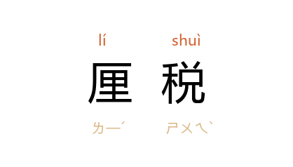 ⒈ 晩清起实行的一种商业税。分坐厘、行厘两种,前者征货物交易税,后者征货物通过税。因税率按货值抽若干厘,故名“厘税”。又叫“厘捐”、“厘金”。咸丰三年(1853年)起征,至1931年裁撤。