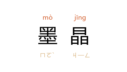 引《二十年目睹之怪现状》第十一回:“近来大兴戴墨晶眼镜。”鲁迅 《彷徨·弟兄》:“白问山 却毫不介意,立刻戴起玳瑁边墨晶眼镜,同到 靖甫 的房里来。”郭沫若 《山中杂记》三:“一双黑眼如像墨晶。”
