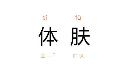 引《孟子·告子下》:“故天将降大任於是人也,必先苦其心志,劳其筋骨,饿其体肤,空乏其身,行拂乱其所为。”《新唐书·韩愈传》:“王公士人奔走膜唄,至为夷法灼体肤,委珍贝,腾沓係路。”贺敬之 《雷锋之歌》五:“阶级体肤的每一个毛孔--都寄托了你火一样的热爱。”