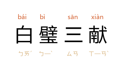 ⒈ 楚 人 和氏 得玉璞,两献 楚王,两遭刖足。第三次王使治璞,得白玉,琢以为璧,世称“和氏璧”。见《韩非子·和氏》。后因以“白璧三献”喻不识良材或怀才不遇。