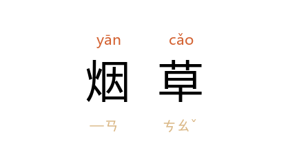 ⒈ 植物名。茄科,一年生草本。高三、四尺,叶大卵形,采下曝干,称为「烟叶」。含尼古丁质,可制卷烟及烟丝等。