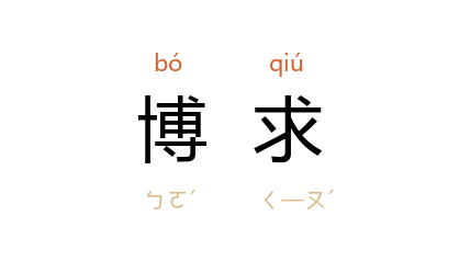 引《史记·孝文本纪》:“今纵不能博求天下贤圣有德之人而禪天下焉,而曰豫建太子,是重吾不德也。”汉 应劭 《风俗通·十反·河内太守司徒颍川韩演》:“盖人君者,闢门开窗,号咷博求,得贤而赏,闻善若警。”宋 姚宽 《西溪丛语》卷下:“姓氏之学…… 汉 以后,精力博求,不难考其渊源至今也。”清 龙启瑞 《送吕介存南游序》:“士之有志於学者,或不得所师承,於是始执业远出,思以博求当世之名人,聆其所传之緖。”