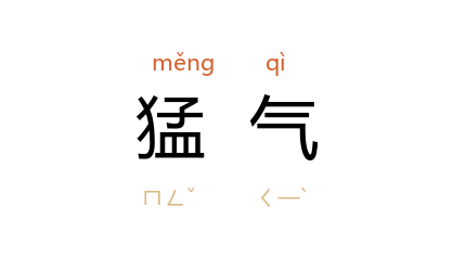 引三国 魏 曹植 《七启》:“哮闞之兽,张牙奋鬣。志在触突,猛气不慴。”唐 杜甫 《高都护骢马行》:“雄姿未受伏櫪恩,猛气犹思战场利。”清 许承钦 《将相谈兵歌题蔡怀真画册》:“年过五十猛气在, 王翦 既老称冠军。”清 吴嘉纪 《垂钓行答郑绛州》:“敛抑猛气上小舟,天海之际垂钓钩。”