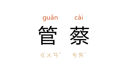 ⒈ 周武王弟管叔鲜与蔡叔度的并称。武王崩,成王幼,周公摄政,管蔡流言于国,谓“公将不利于孺子”,周公避居东都,后成王迎周公归,管蔡惧,挟纣子武庚叛,成王命周公讨伐,诛杀武庚与管叔鲜,流放蔡叔度,其乱终平。事见《书·金縢》及《史记·管蔡世家》。