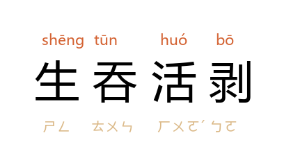 ⒈ 本指唐张怀庆喜欢剽窃名士诗文,而遭时人讥为:「活剥王昌龄,生吞郭正一。」见唐·刘肃《大唐新语·卷一三·谐谑》。后比喻做学问或学习某事,只是一味的袭用他人的经验或成果,而不求甚解。明·徐渭〈奉师季先生书〉:「大约谓先儒若文公者,著释速成,兼欲尽窥诸子百氏之奥,是以冰解理顺之妙固多,而生吞活剥之弊亦有。」也作「活剥生吞」。