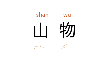 引《关尹子·三极》:“时翔物,时逐物,时山物,时渊物,端乎权乎,狂乎愚乎。”《周礼·考工记·画繢》“山以章” 汉 郑玄 注:“章,读为‘獐’。獐,山物也。”明 王履 《以山中所得松实万年松分遗友人》诗:“偶携山物馈诸公,明日都来问所逢。”
