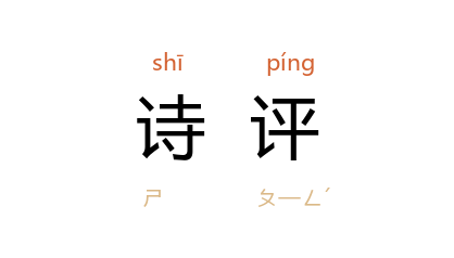 ⒉ 作为评论诗的一种著作名称。如宋严羽《沧浪诗话》有《诗评》篇;清查慎行有《初白庵诗评》。