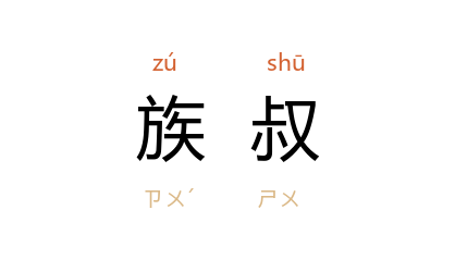 ⒈ 族父中年少于父者。亦称同族中与父同辈而年少于父者。 南朝 齐 王融 有《赠族叔卫军俭》诗。
