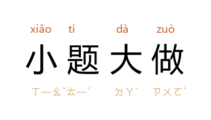 ⒈ 亦作“小题大作”。明·清科举考试,以“四书”文句命题叫“小题”,以“五经”文句命题叫“大题”。“小题大作”本谓以五经文之法作四书文,后引申为拿小题目作大文章。喻把小事渲染得很大,或当作大事来处理。有不值得、不恰当的意思。