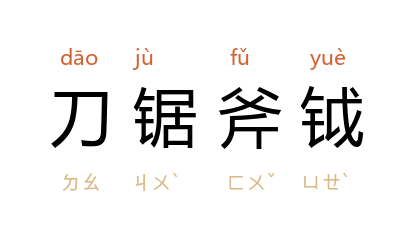 引清 蒲松龄 《聊斋志异·小翠》:“翁无烦怒!有新妇在,刀锯斧鉞,妇自受之,必不令貽害双亲。”瞿秋白 《乱弹·水陆道场·民族的灵魂》:“这些阎王也正在准备着刀锯斧钺,油锅炮烙,大家商量着怎样来瓜分脔割。”