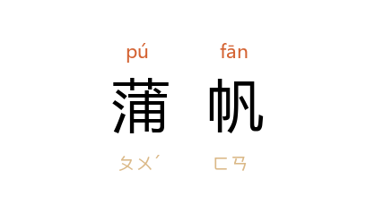 引唐 李贺 《江南弄》诗:“水风浦云生老竹,渚暝蒲帆如一幅。”宋 梅尧臣 《使风》诗:“跨下桥南逆水风,十幅蒲帆弯若弓。”郁达夫 《离乱杂诗》之八:“细雨蒲帆游子泪,春风杨柳故园情。”