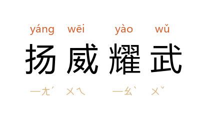 引《京本通俗小说·冯玉梅团圆》:「只因武备久弛,军无纪律,教他杀贼,一个个胆寒心骇,不战自走;及至遇著平民,抢虏财帛子女,一般会扬威耀武。」《青衫记·第一二出》:「金镫齐敲,旗悬太白高。扬威耀武,转战敢辞劳?」