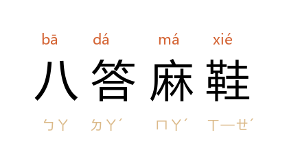 ⒈ 每只有四对耳圈的麻鞋,穿时需用绳子将八只鞋耳相互穿搭,故称为「八答麻鞋」。