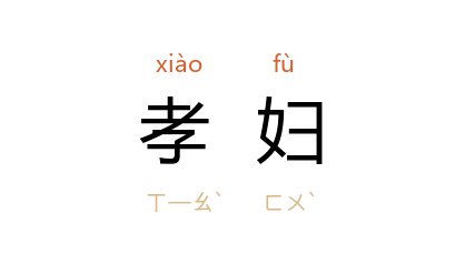 引《汉书·于定国传》:“东海 有孝妇,少寡,亡子,养姑甚谨。”《明史·列女传二·倪氏》:“姑鼻患疽垂毙,躬为吮治,不愈,乃夜焚香告天,割左臂肉以进,姑啖之愈。远近称孝妇。”清 陈梦雷 《丁巳秋道山募建普度疏》:“昔孝妇含寃,尚阻三年之雨;忠臣被谤,犹飞六月之霜。”