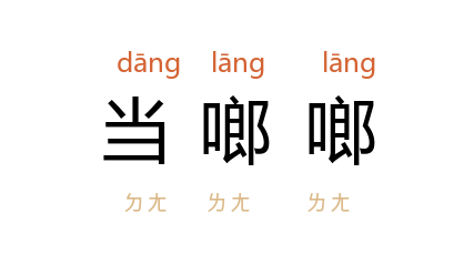 引《儿女英雄传》第六回:“那凶僧……咕咚往后便倒;噹啷啷,手里的刀子也扔了。”《三侠五义》第三九回:“从外面飞进一物,不偏不歪,正打在 赵虎 擎的那个酒杯之上,只听噹啷啷一声将酒杯打了个粉碎。”
