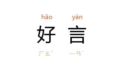 引汉·王符《潜夫论·明暗》:「赵高入称好言以说主,出倚诏令以自尊。」《红楼梦·第六八回》:「只求妹妹在二爷跟前替我好言方便方便,留我个站脚的地方儿。」